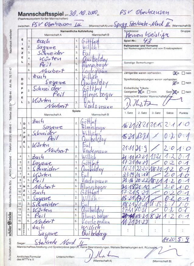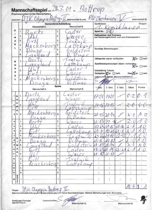 Zum Auftakt gab es nach 3 umkämpften und jeweils erst im dritten Satz entschiedenen Doppeln eine 2:1 Führung, wobei hier sicherlich auch jedes andere Ergebnis möglich gewesen wäre. In den Einzeln ging es dann zunächst ausgeglichen zu: Frank Schneider siegte gegen Sendrowski (-15,14,12), Friedhelm Sagawe unterlag gegen Groll (-17,-16), Dieter Kürten unterlag gegen Schulz (-14,-10) und Peter Zach, der endlich seine Form wiedergefunden zu haben scheint, siegte gegen Stanev (19,-18,16).