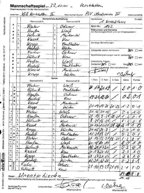 Nach 4 Stunden Spielzeit stand der Sieg gegen die (bisher) beste Rückrundenmannschaft fest. In einem an Spannung kaum zu überbietenden Spiel konnte sich am Ende die glücklichere Mannschaft durchsetzen; das Satzverhältnis von 21:21 spricht für sich.